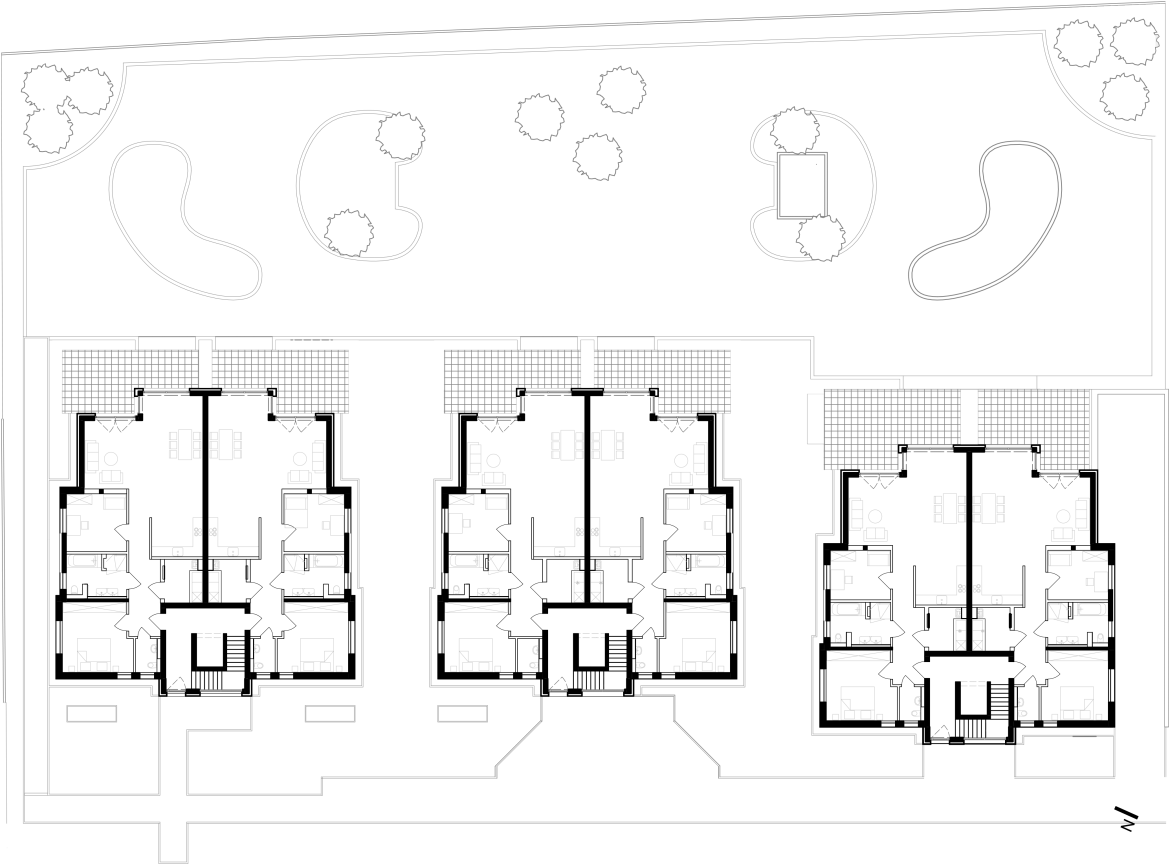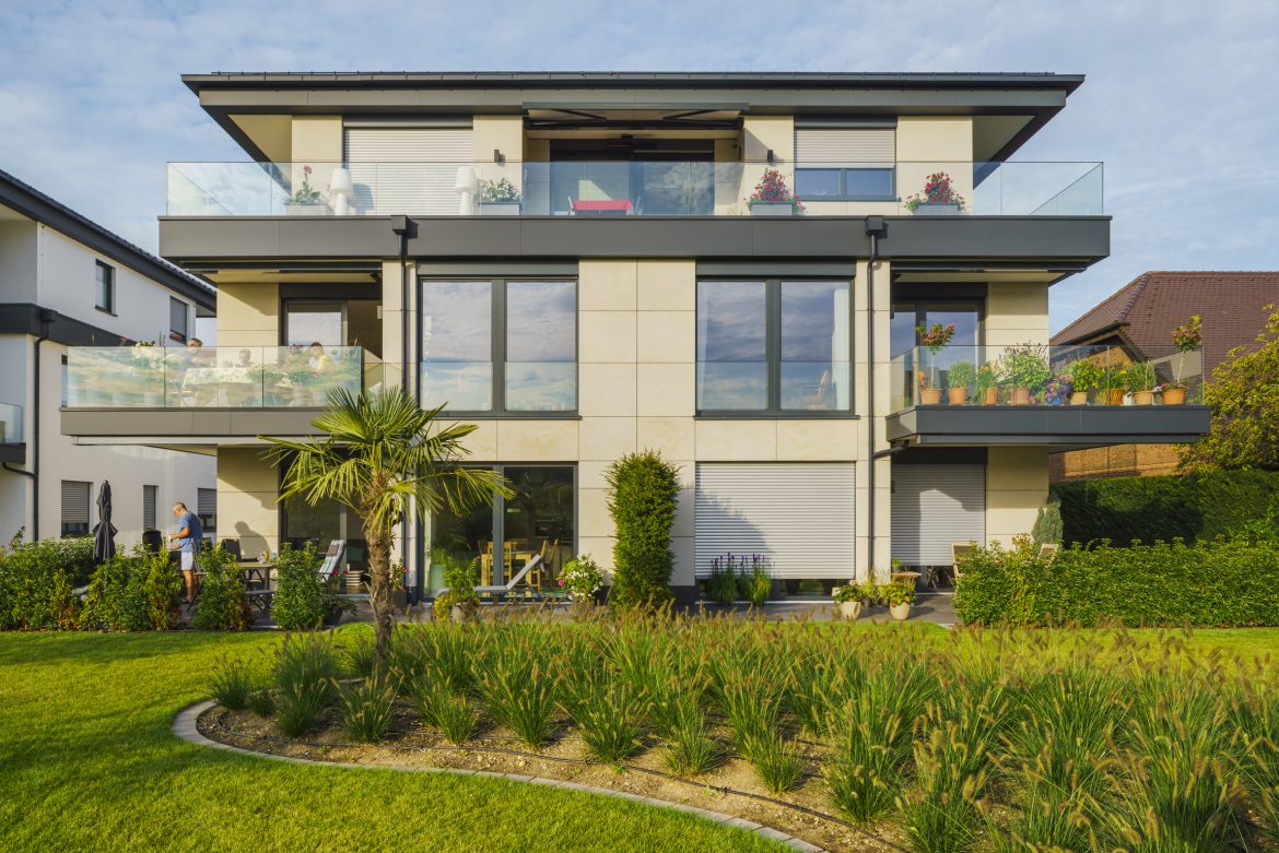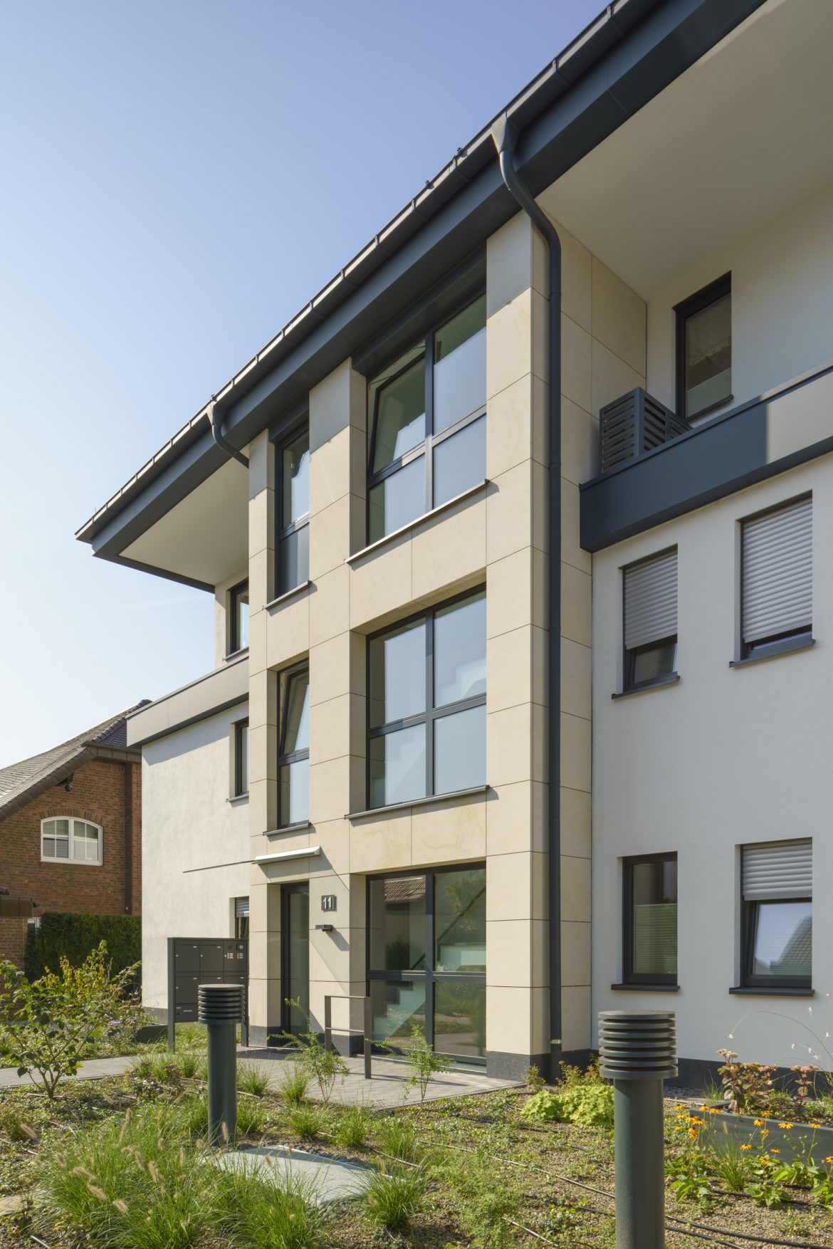 Bereits im Frühjahr 2019 erhielten wir den Auftrag zur Umsetzung eines seit Jahren in der Planung befindlichen Mehrfamilienhausensemble. Das Grundstück befindet sich in direkter Rheinlage in Niederkassel. Die an uns gestellte Aufgabe, die exakten Vorstellungen der Bauherren umzusetzen, wurde mit dem Beginn einer aufwendigen und detailstarken Ausführungsplanung in Angriff genommen. Bereits im Dezember 2019 konnten die Rohbauarbeiten starten. In nur 12 Monaten waren die ersten Wohnungen bezugsfertig, die Gesamtfertigstellung mit Straßen- und Außenanlagenbau dauerte bis Mai 2021. Auf einer gemeinsamen Tiefgarage mit direktem Zugang zu den 3 Mehrfamilienhäusern entstanden hier insgesamt 15 Wohneinheiten – alle mit Ausrichtung zum nahen Rhein. Die Fassaden gliedern sich in Bereiche mit klassischen weißen Putzflächen und vorgehängten, hinterlüfteten Sandsteinplatten. Alle Balkone und Dachterrassen wurden mit Ganzglasbrüstungen versehen. Der markante Dachabschluss wird durch dunkle Metalleindeckungen betont.
